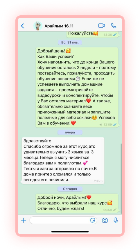 • Куратор, принимающий домашнее задание по WhatsApp, и координирующий по доработке домашнее задание в случае его неполного выполнения.