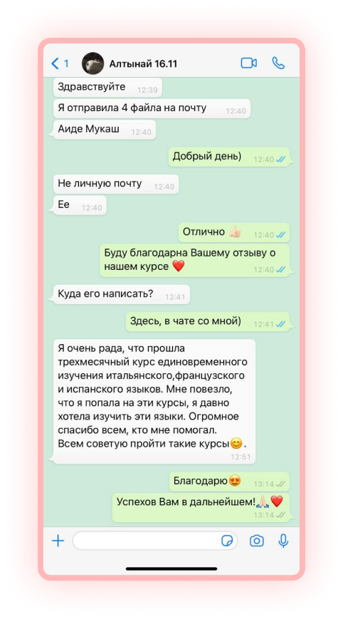 • Поддержка и помощь эксперта по WhatsApp на протяжении всего курса и 2 месяца после него